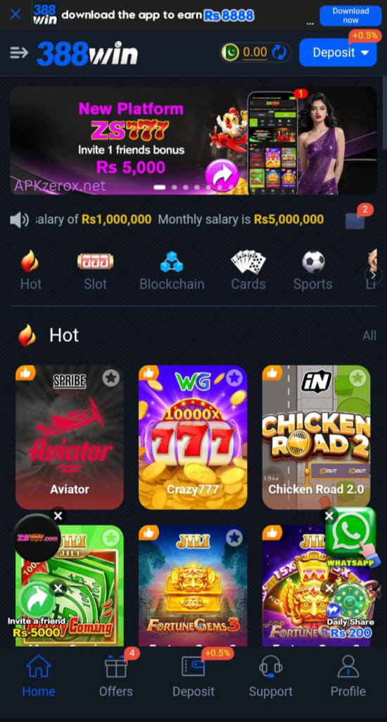 The 388 Win Game is an online betting application where users can earn real money based on their luck. Users can earn unlimited bonuses and daily login rewards and easily withdraw funds to their accounts via local payment methods such as Jazz Cash and Easy Pay. It offers a variety of games, making the app more engaging. Whale, in designing this application, has used state-of-the-art technology, making it one of the safest platforms. It gives a safe gaming experience to its users. To download this app, visit our official website. The registration process is mentioned above. Download it now and start your earning journey.
